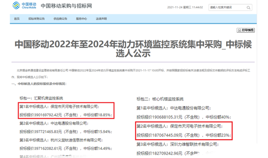 天河電子中標(biāo)中國(guó)移動(dòng)2024-2026動(dòng)環(huán)監(jiān)控集采項(xiàng)目